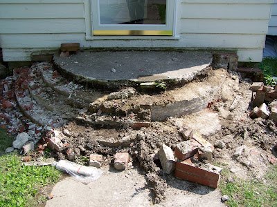 No, fortunately this isn't from another earthquake. It's from Jeff & Rachael and a couple of sledgehammers! Our house was built in 1939 and the bricks on the stairs had been crumbling. The original plan had been to tear out all of the concrete and build a whole new porch, but since the foundation is in such good shape, I think that we'll be able to just add new bricks!